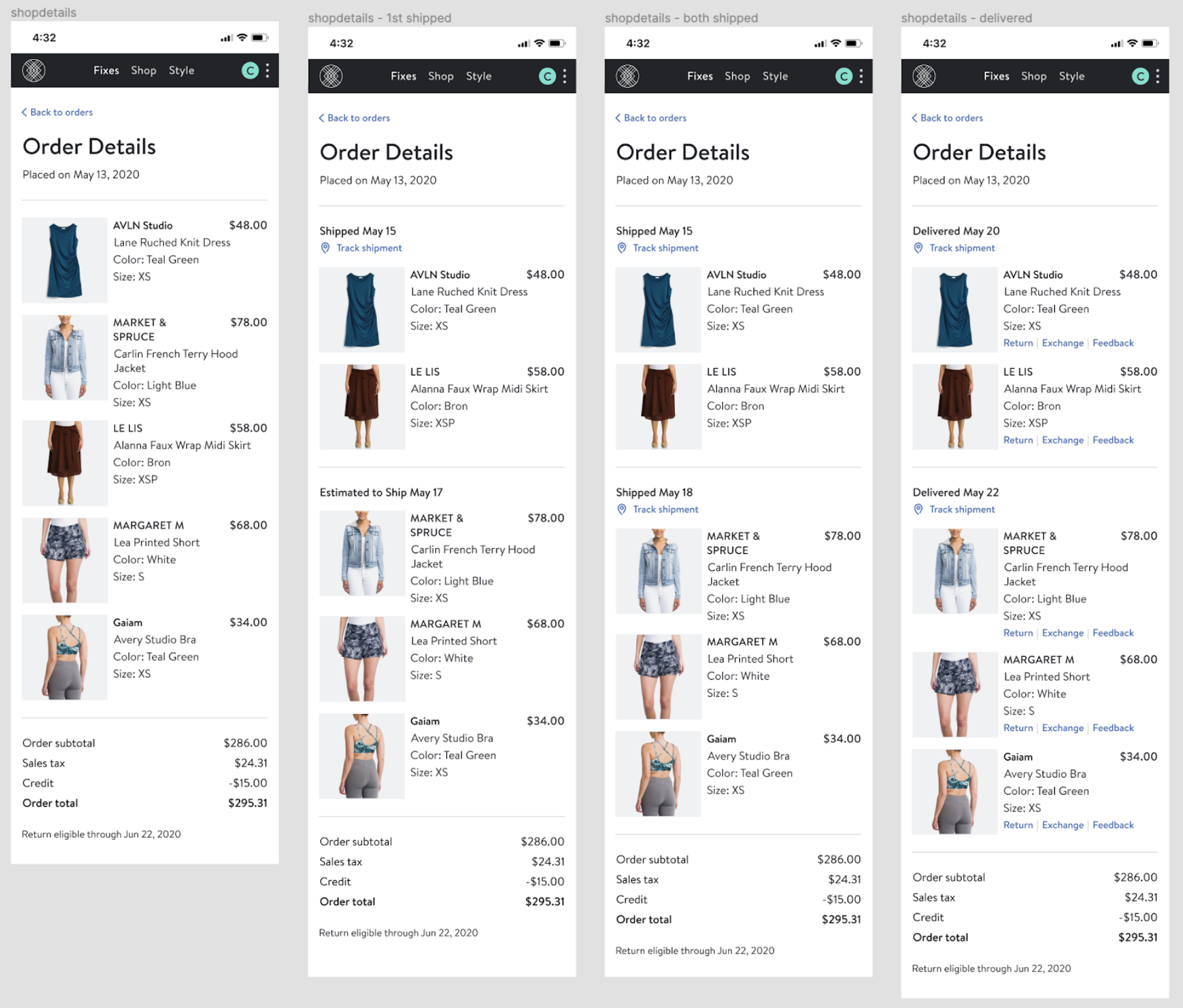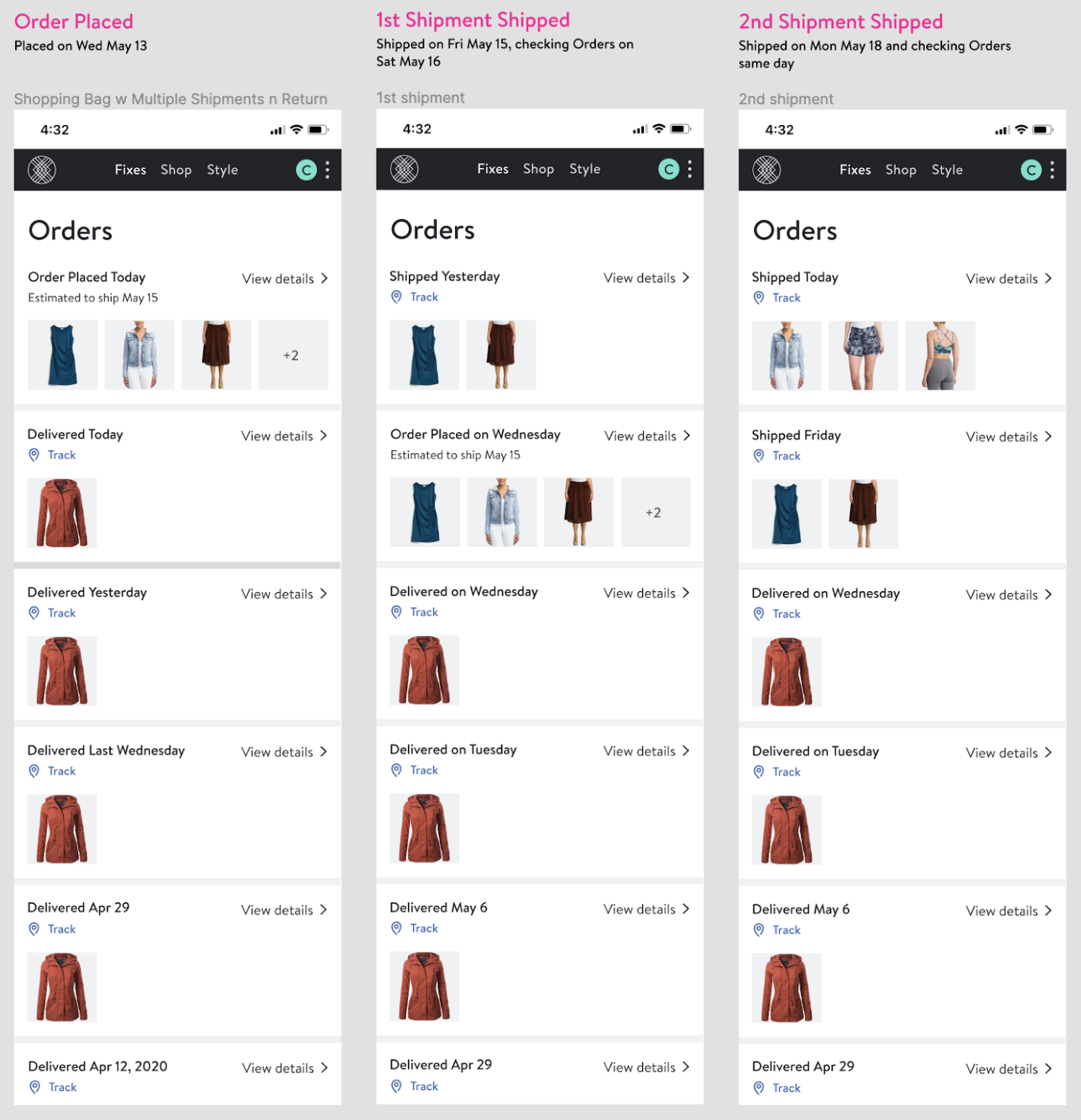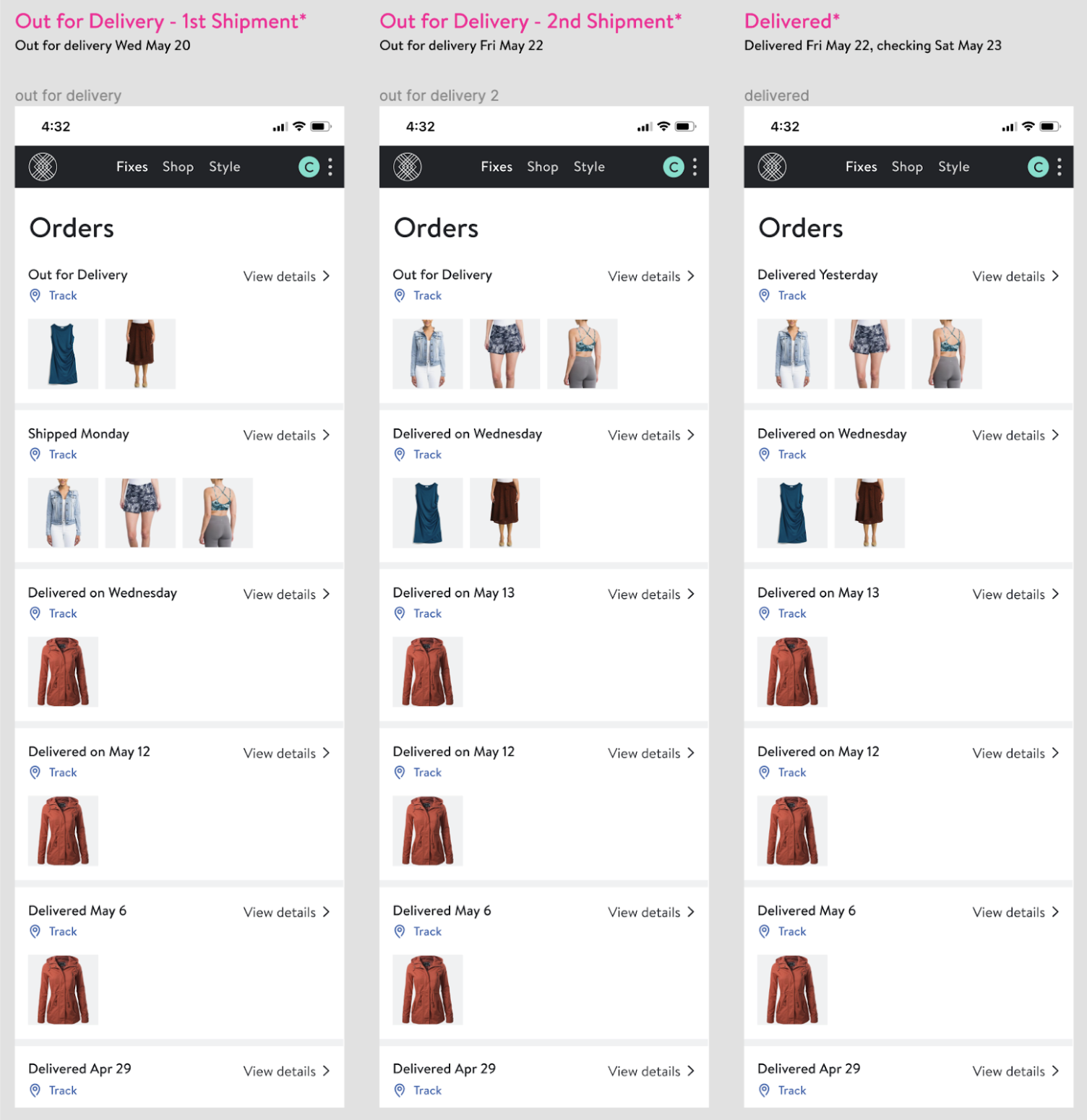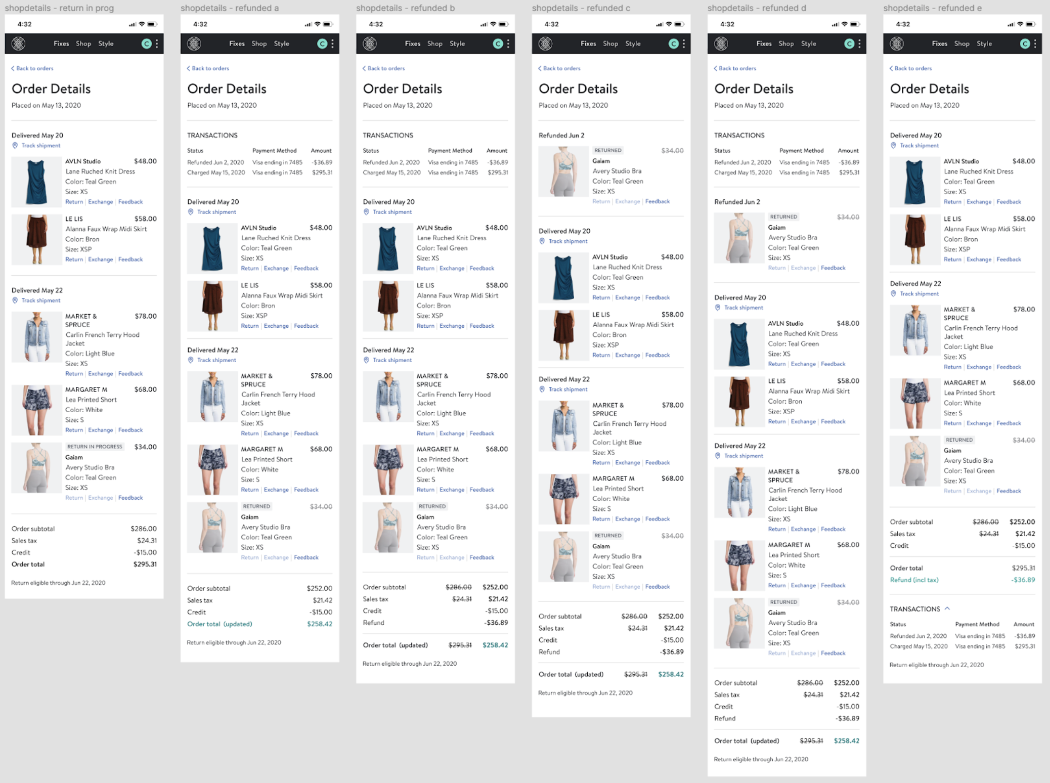 Throughout the course of the project, the designs went through extensive creative review by the UX team and feature teams, as well as a CX agent focus group. I identified which event statuses around refunds and deliveries were of most interest to customers and pushed to obtain those statuses via package tracking and in partnership with the warehouse team. I also considered which order updates required permanency and how to structure the updates within an order. For example, does ‘Order placed’ persist or fade away after the items have been delivered? We faced certain constraints around the statuses we had access to from carriers: how much of a deal breaker was it that we weren’t integrated with carriers to obtain a ‘Delivered’ status for our direct orders initially? Do customers care that their return has been received by the warehouse, or do they only care about getting their money refunded? If an order is canceled due to fraud, does a ‘Canceled’ status provide relief or erode trust?